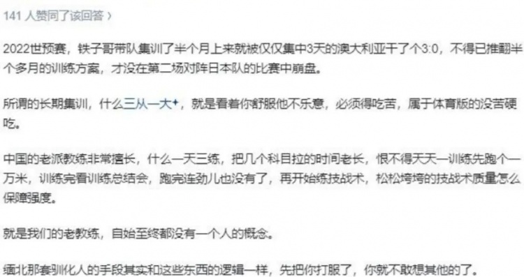 所以,問題不在集訓本身,而在于現(xiàn)在大環(huán)境改變下傳統(tǒng)意義上長期集訓表現(xiàn)出的不適應性。集訓本身在這一過程中有什么錯呢?而且宮魯鳴的話“只有長期集訓才能提升默契貫徹戰(zhàn)術。”這一“只有...才...”的句式起碼是基于過去的實踐經驗得出的結論;而在這一問題下的討論里,我們能看到大量“只要…就…”般的許愿。