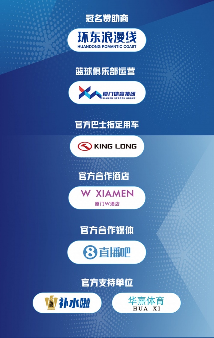 感謝集團兄弟公司廈門體育產業(yè)集團環(huán)東文旅運營有限公司的冠名贊助,感謝廈門金龍集團、廈門W酒店、、華熹體育、東鵬特飲對球隊的鼎力支持,感謝所有贊助商與幕后團隊的同行!