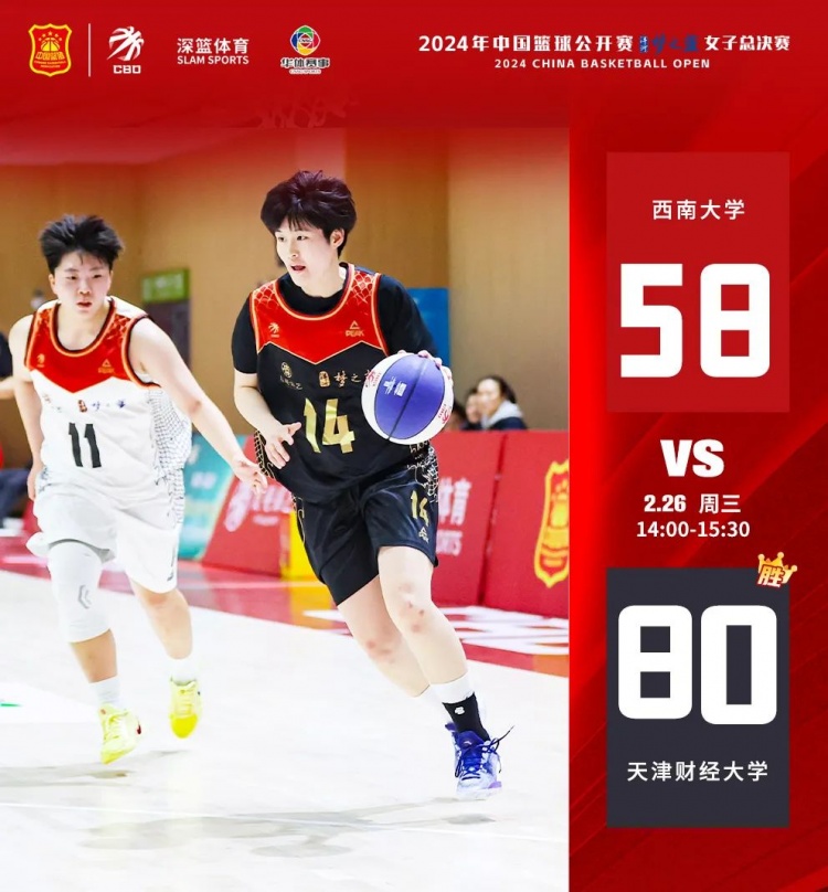 上半場首節(jié),兩隊打得相對膠著,比分緊咬。第二節(jié),西南大學手感欠佳,單節(jié)只得到9分。天津財經大學則保持著不錯的進攻勢頭,單節(jié)拿到25分。半場結束,天津財經大學37-24領先西南大學。下半場,西南大學7號應茵、12號莫琇雅前后場籃板拼搶積極,但無奈前期存在一定差距,最終西南大學58-80不敵天津財經大學。