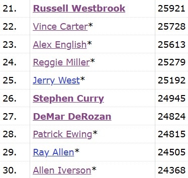 本場(chǎng)比賽過(guò)后,德羅贊生涯總得分超越帕特里克-尤因,上升至NBA歷史第27位,排在他前面的是庫(kù)里。