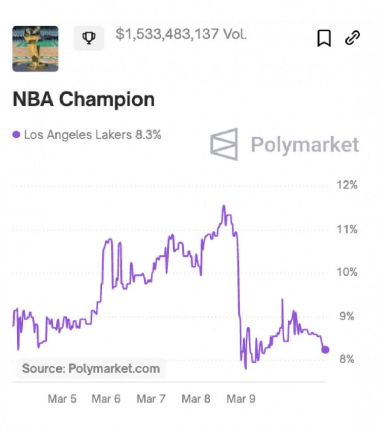 賽后美媒Polymarket更新了湖人的奪冠概率——8.3%。