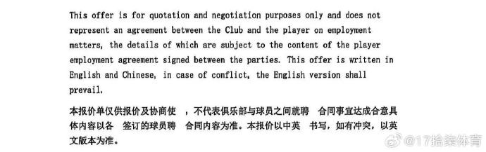 二 多家俱樂部對哈雷爾感興趣并進(jìn)行了談判,其間另一家中方經(jīng)紀(jì)公司在浙江稠州銀行俱樂部與哈雷爾的談判過程中簽訂了一份報(bào)價(jià)單,其中明確約定“該報(bào)價(jià)單僅供報(bào)價(jià)和協(xié)商使用,不代表球員與俱樂部完成聘用合同簽約。”——這也是浙江稠州銀行俱樂部多次公告中含糊其辭提及的“簽約”。最后,在多家俱樂部中談判協(xié)商中球員哈雷爾于二月十日選擇了簽約新疆廣匯俱樂部,三方按中國籃協(xié)和CBA公司要求簽訂了標(biāo)準(zhǔn)合同并在中國籃協(xié)完成了經(jīng)紀(jì)人備案。