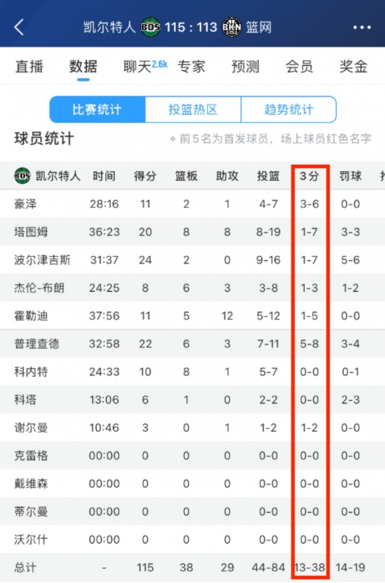 本場比賽,凱爾特人全隊三分整體來說有些失準(zhǔn),38投13中,命中率僅34.2%;除了普理查德(8中5)和豪澤(6中3)正常發(fā)揮外,其余人皆失常,僅24中5。