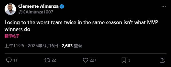 賽后,雷霆記者Clemente Almanza發(fā)推寫道:“同一個賽季兩次輸給聯(lián)盟最差的球隊,這可不是MVP該有的表現(xiàn)哦?!?/p>