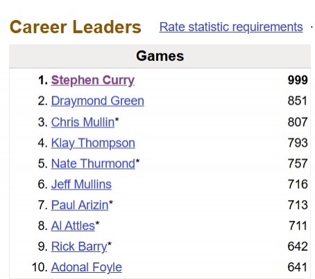 這樣一來庫(kù)里解鎖常規(guī)賽生涯第1000場(chǎng)比賽,勇士隊(duì)史首人!