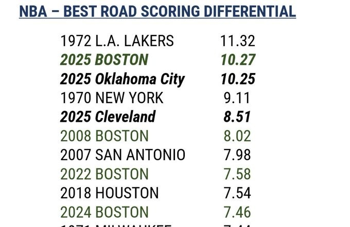 據(jù)統(tǒng)計(jì),本場(chǎng)比賽過后,凱爾特人的賽季場(chǎng)均客場(chǎng)凈勝分來到10.27,超越本賽季的雷霆(10.25),升至歷史第二位,僅次于1972年的湖人。