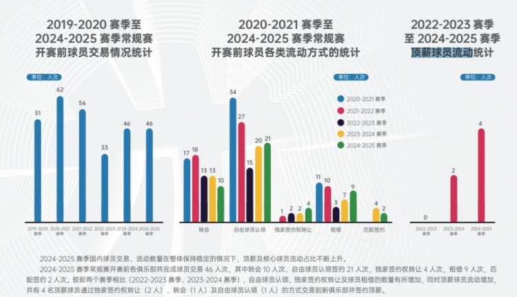 配簽約2人次。較前兩個賽季相比(2022-2023賽季、2023-2024賽季),自由球員認領(lǐng)、獨家簽約權(quán)轉(zhuǎn)讓及球員租借的數(shù)量有所增加,同時頂薪球員流動增加,共有4名頂薪球員通過獨家簽約權(quán)轉(zhuǎn)讓(2人)、轉(zhuǎn)會(1人)及自由球員認領(lǐng)(1人)的方式交易到新俱樂部并簽約頂薪。