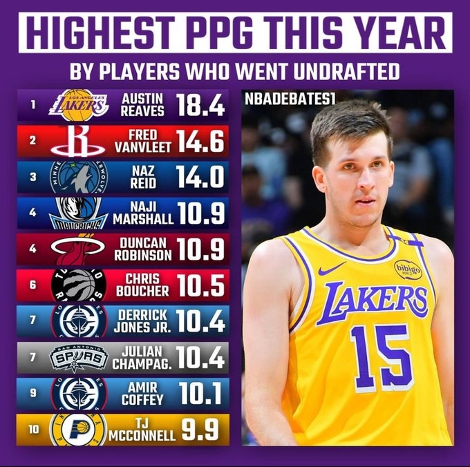 本賽季落選秀場均得分榜:里夫斯18.4分第1 范喬丹&里德排2、3位 2025/02/14