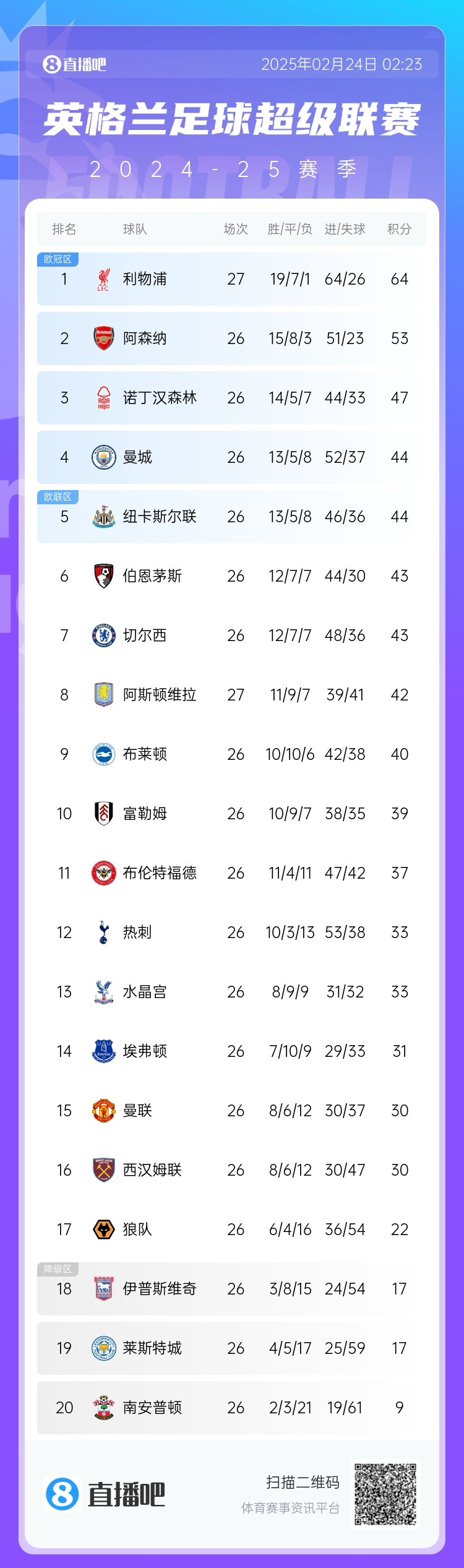 02月24日訊 曼城主場(chǎng)不敵利物浦,26輪英超后積44分位居第4。