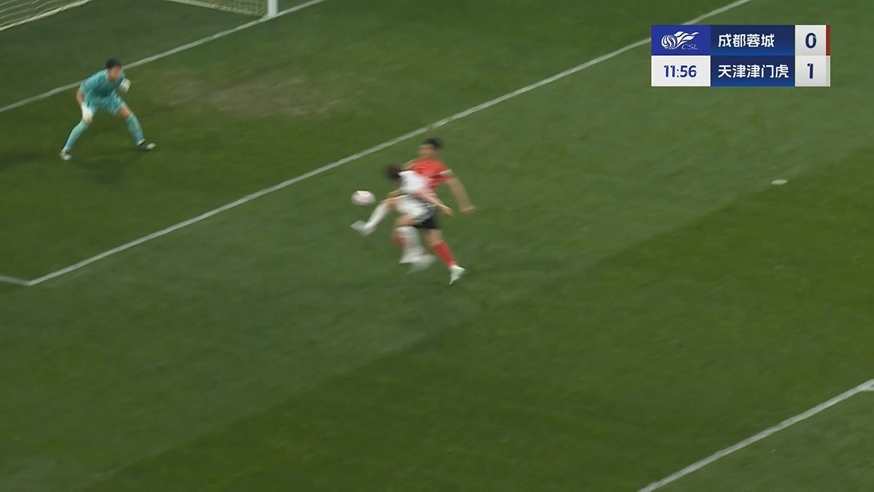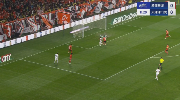 03月02日訊 中超第二輪,成都蓉城vs天津津門虎,第12分鐘,哈達(dá)斯邊路接后場長傳,隨后送出傳中,王秋明門前不停球搶點(diǎn)得手,蓉城0-1落后津門虎!