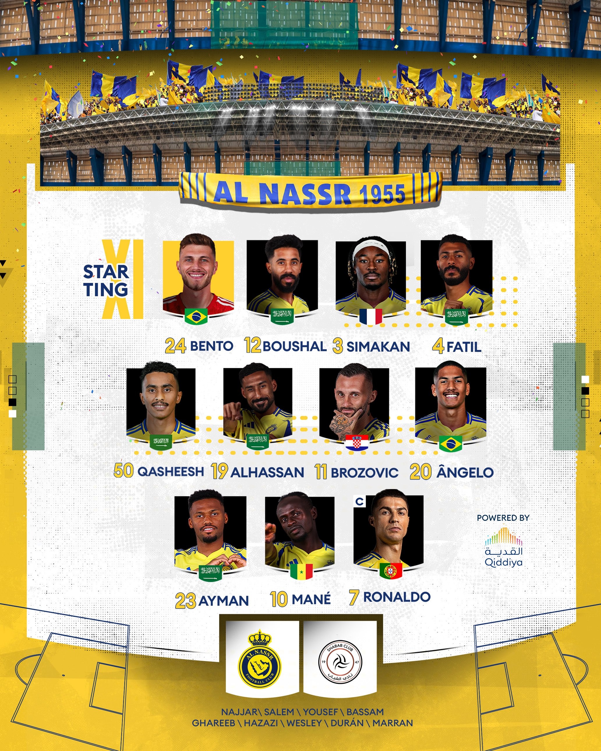 3月8日訊 沙特聯(lián)第24輪,利雅得勝利主場(chǎng)對(duì)陣?yán)诺们嗄耆?。賽前,官方公布了本?chǎng)的首發(fā)名單。