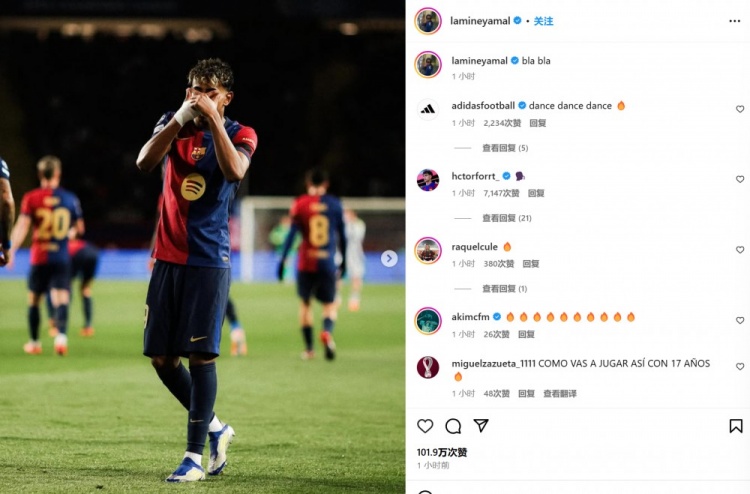 亞馬爾還通過社媒曬出自己的慶祝照,并配文:“bla bla”,似乎是在回?fù)艚趯λ馁|(zhì)疑。