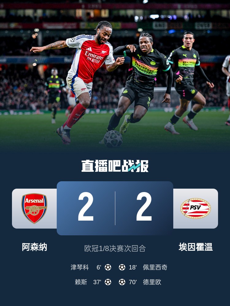 歐冠1/8決賽次回合,阿森納2-2戰(zhàn)平埃因霍溫,總比分9-3晉級(jí)八強(qiáng)。上半場,津琴科破門,佩里西奇扳平,賴斯頭球建功,斯特林送出2次助攻&錯(cuò)失1次單刀球機(jī)會(huì);下半場,德里歐挑射破門。