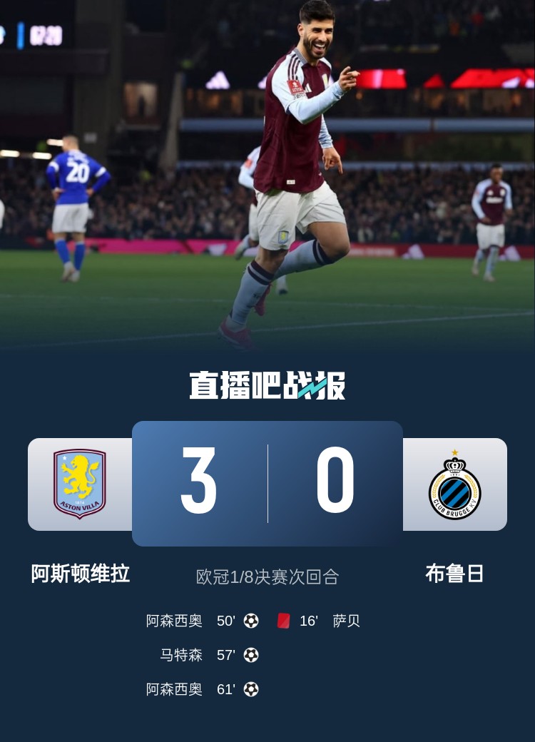 歐冠1/8決賽次回合,維拉3-0擊敗布魯日,總比分6-1晉級(jí)歐冠8強(qiáng)。上半場,大馬丁精準(zhǔn)長傳找到拉什福德,后者制造直紅;下半場,阿森西奧替補(bǔ)登場雙響,另有一次中柱,拉什福德貢獻(xiàn)1助攻,馬特森打進(jìn)1球。
