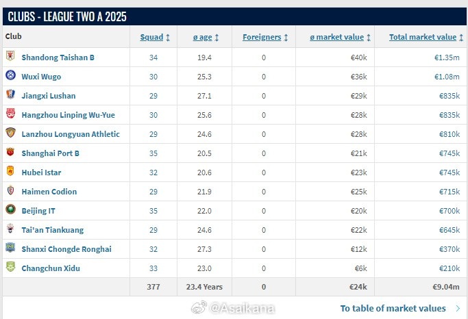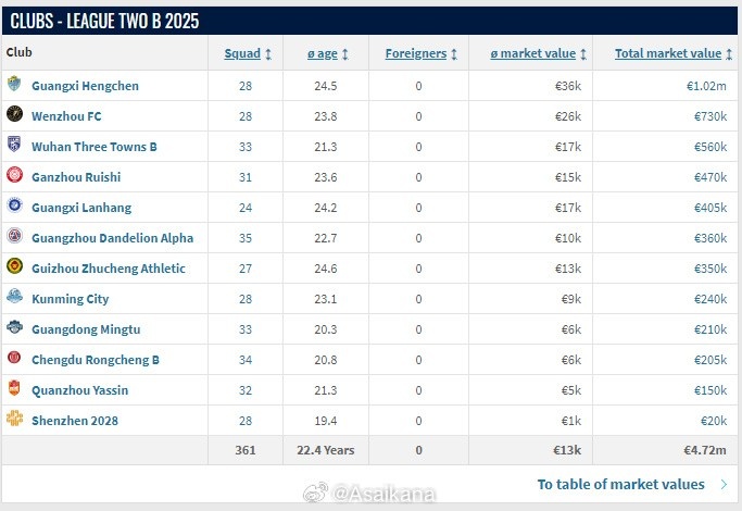 2025賽季中乙各隊(duì)名單已在轉(zhuǎn)會市場網(wǎng)更新。球隊(duì)總身價方面,山東泰山B隊(duì)以135萬歐元列第一,后面依次是無錫吳鉤(108萬歐)、廣西恒宸(102萬歐)、江西廬山(83.5萬歐)、杭州臨平吳越(83.5萬歐)、蘭州隴原競技(81萬歐)、上海海港B隊(duì)(74.5萬歐)、湖北青年星(74.5萬歐)、溫州(73萬歐)、南通海門珂締緣(71.5萬歐)、北京理工(70萬歐)、泰安天貺(64.5萬歐)、武漢三鎮(zhèn)B隊(duì)(56萬歐)、贛州瑞獅(47萬歐)、廣西藍(lán)航(40.5萬歐)、山西崇德榮海(37萬歐)、廣州蒲公英(36萬歐)、貴州筑城競技(35萬歐)、昆明城市(24萬歐)、廣東銘途(21萬歐)、長春喜都(21萬歐)、成都蓉城B隊(duì)(20.5萬歐)、泉州亞新(15萬歐)、深圳二零二八(2萬歐)。