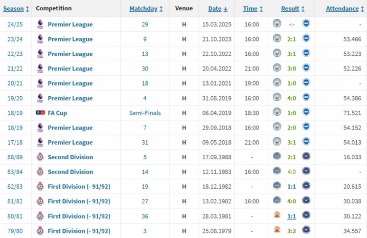 12勝2平,曼城歷史上各項(xiàng)賽事主場對陣布萊頓未嘗敗績