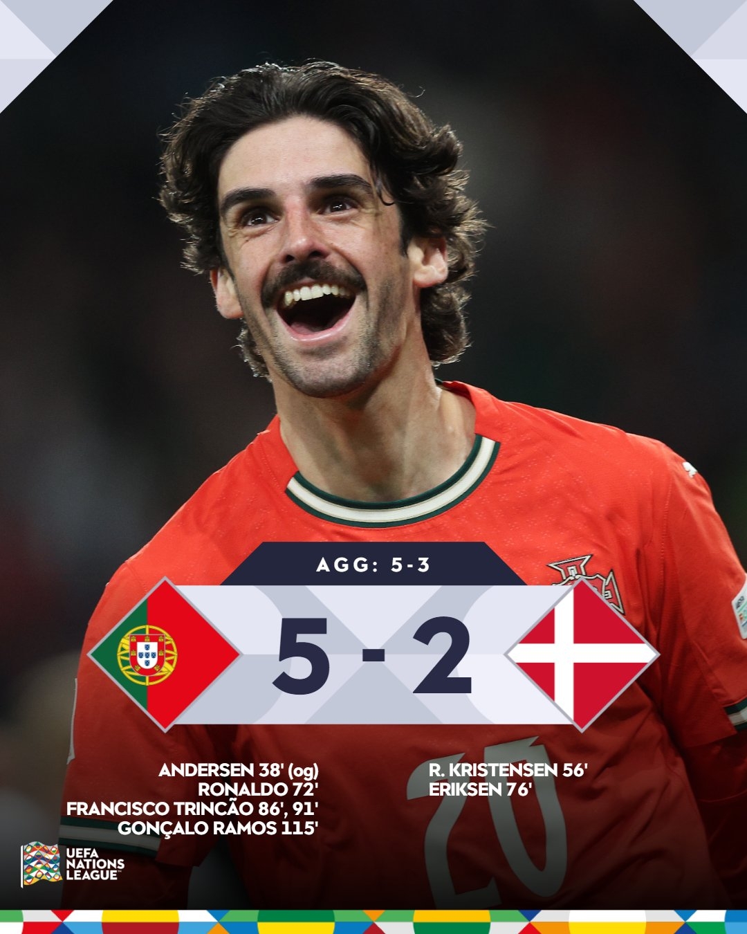 歐國聯(lián)八強戰(zhàn)次回合,葡萄牙5-2,總比分5-3戰(zhàn)勝丹麥,C羅失點+破門。
