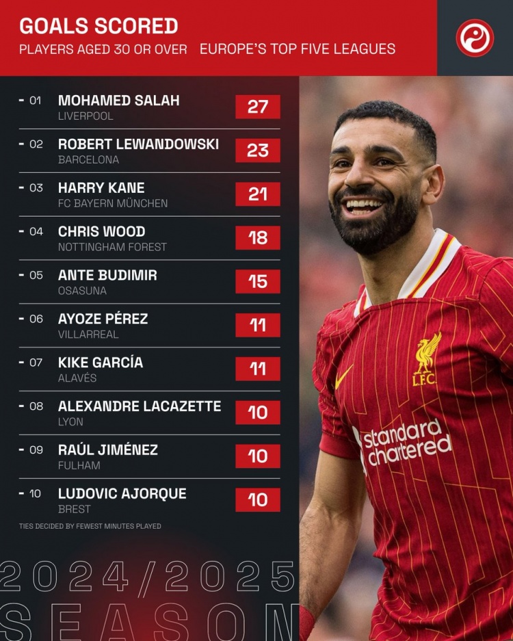 3月29日訊 據(jù)Squawka數(shù)據(jù)統(tǒng)計(jì),本賽季五大聯(lián)賽僅三名30歲及以上球員打進(jìn)20個(gè)以上的聯(lián)賽進(jìn)球,分別是薩拉赫、萊萬(wàn)以及凱恩。