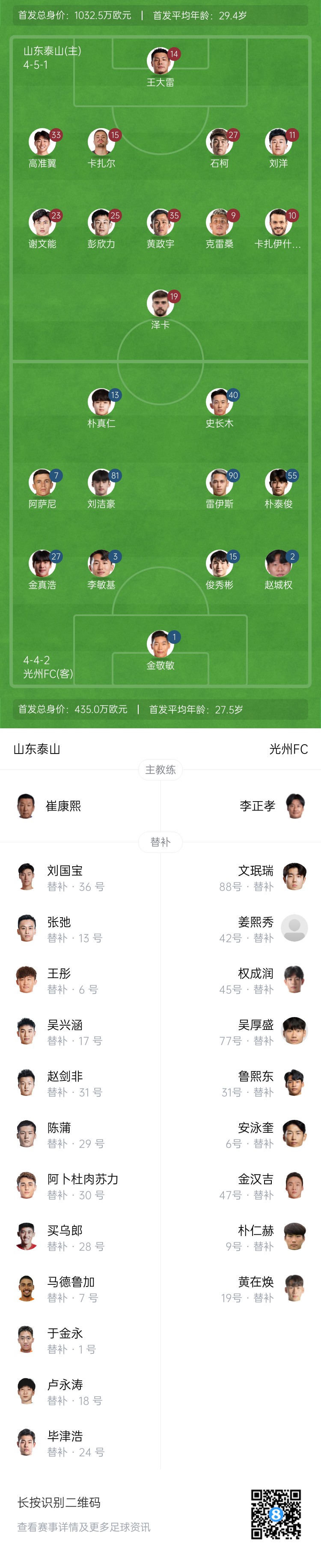 泰山vs光州首發(fā):4外援PK2外援,卡扎爾首秀,謝文能、石柯出戰(zhàn)