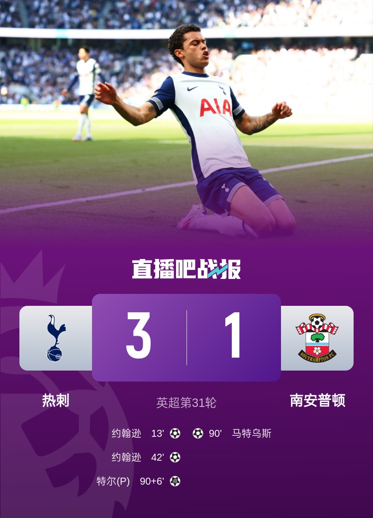 熱刺本輪3-1擊敗南安普頓,圣徒在聯(lián)賽剩余7輪的情況下提前降級,也創(chuàng)下了聯(lián)賽紀錄。