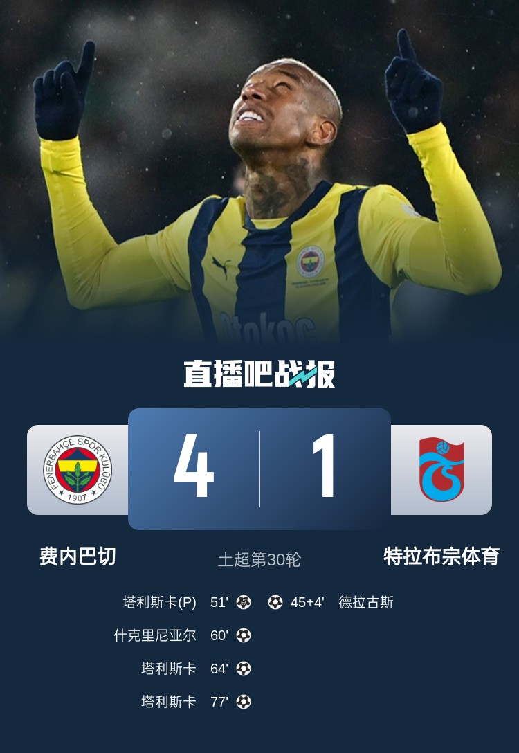 費內(nèi)巴切本輪4-1擊敗特拉布宗體育,塔利斯卡戴帽,費內(nèi)巴切距榜首3分。