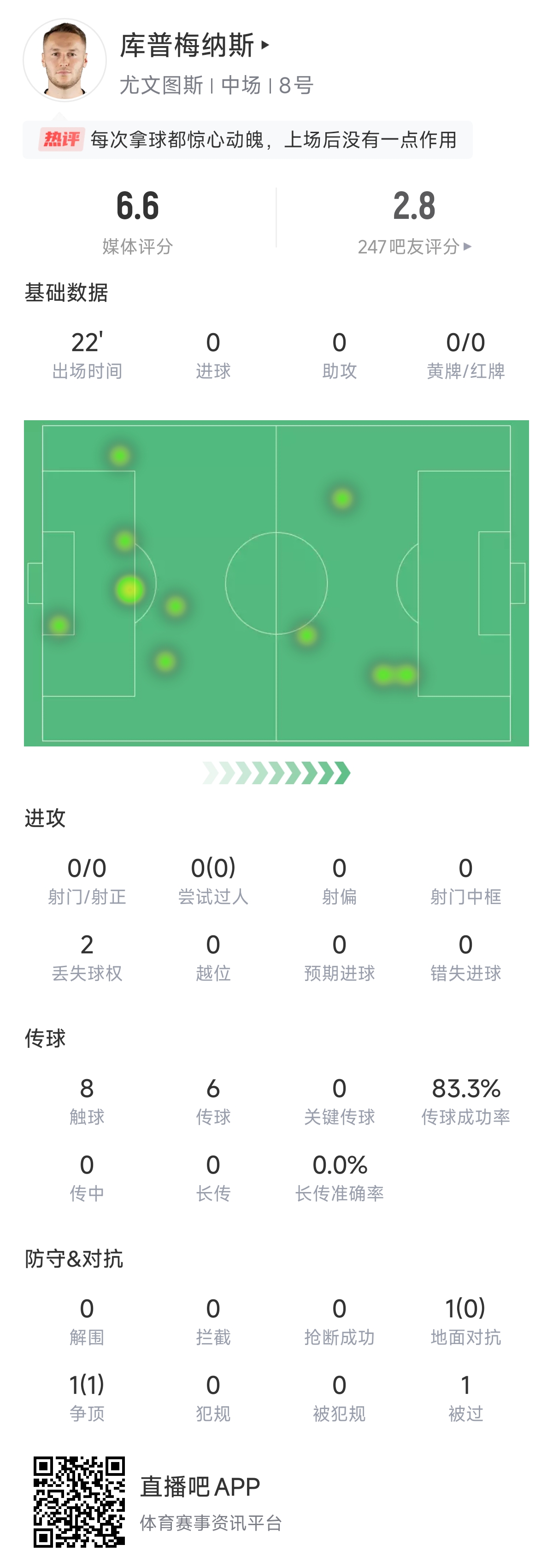 本賽季轉(zhuǎn)會尤文以來,庫普梅納斯坐穩(wěn)主力,但是表現(xiàn)一直得不到認(rèn)可。他至今為尤文出戰(zhàn)30場只有2球3助,作為前腰數(shù)據(jù)略顯慘淡。