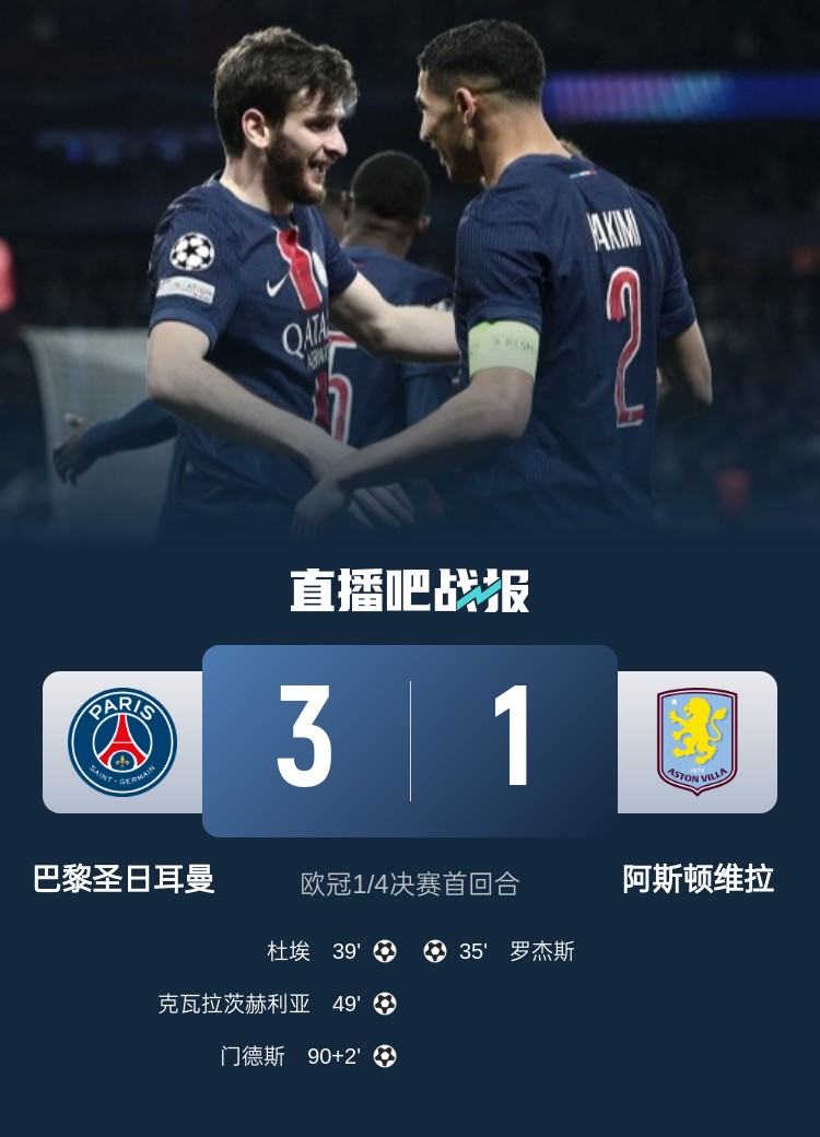 歐冠8強(qiáng)首回合,巴黎3-1擊敗維拉,杜埃破門(mén),克瓦拉茨赫利亞精彩一條龍,門(mén)德斯補(bǔ)時(shí)再入一球。
