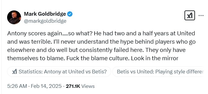 英國(guó)著名曼聯(lián)球迷頻道The United Stand的主理人Mark Goldbridge對(duì)此表示道:“安東尼又進(jìn)球了...那又怎么樣?他在曼聯(lián)待了2年半時(shí)間,表現(xiàn)很糟糕。我永遠(yuǎn)無(wú)法理解那些去其他地方表現(xiàn)很好的球員背后的炒作,不過(guò)他們總是在這里失敗。他們只能怪自己,去他*的責(zé)備文化,照照鏡子吧。”