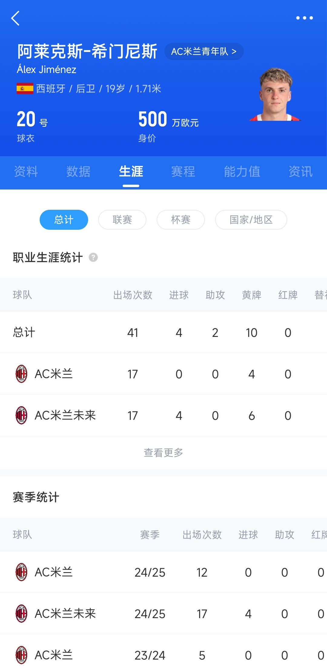 2024年夏窗,希門尼斯以500萬歐元的買斷費(fèi)正式從皇馬加盟米蘭,簽約至2028年。本賽季希門尼斯已經(jīng)代表AC米蘭出戰(zhàn)12場比賽,出場時間685分鐘。