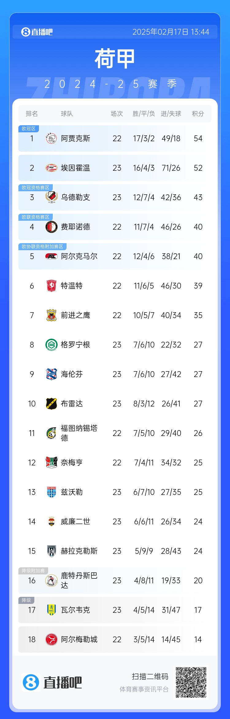殺瘋了!賈府7連勝少賽一場2分領(lǐng)跑荷甲,埃因霍溫狂轟31腳憾平