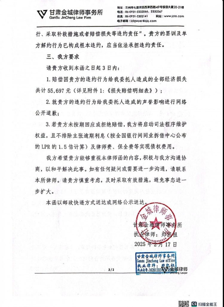 今天,蘭州隴原競技在官方賬號發(fā)布律師函,律師函內(nèi)容顯示,截止2025年2月16日,孟祥昱教練組已正式提出解約,并退回已發(fā)薪酬。
