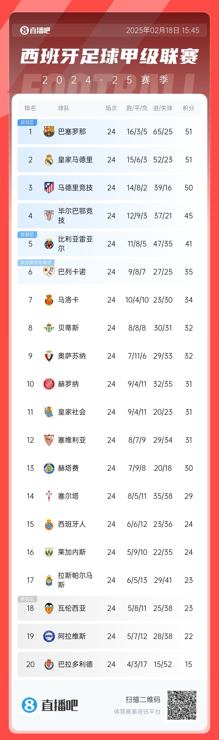 02月18日訊 本輪西甲巴薩1-0戰(zhàn)勝巴列卡諾,目前和皇馬同積51分,憑借凈勝球優(yōu)勢(shì)領(lǐng)跑積分榜。