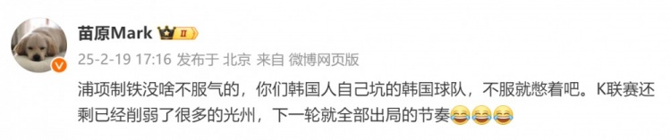媒體人苗原發(fā)文表示:浦項(xiàng)鐵人沒啥不服氣的,你們韓國人自己坑的韓國球隊(duì),不服就憋著吧。K聯(lián)賽還剩已經(jīng)削弱了很多的光州,下一輪就全部出局的節(jié)奏。