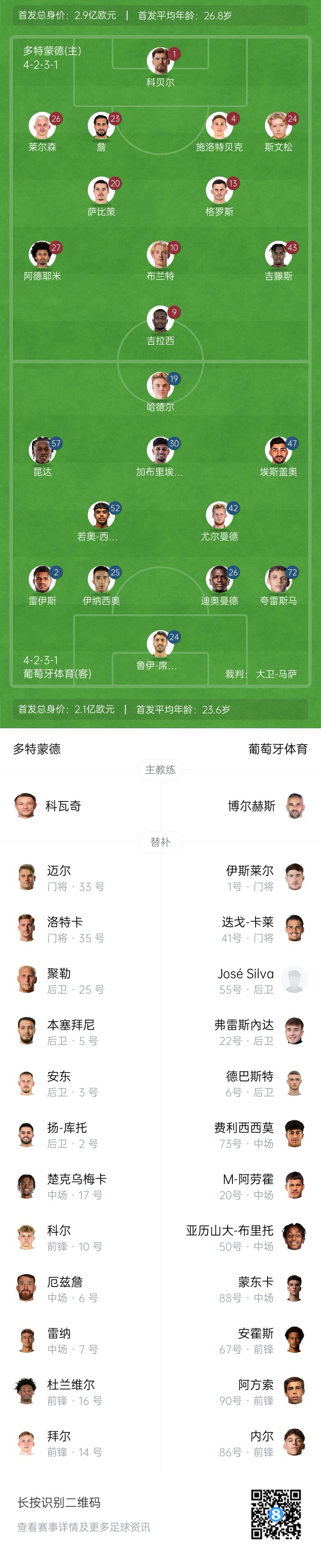 多特vs葡體首發(fā):吉拉西、阿德耶米、吉滕斯先發(fā)