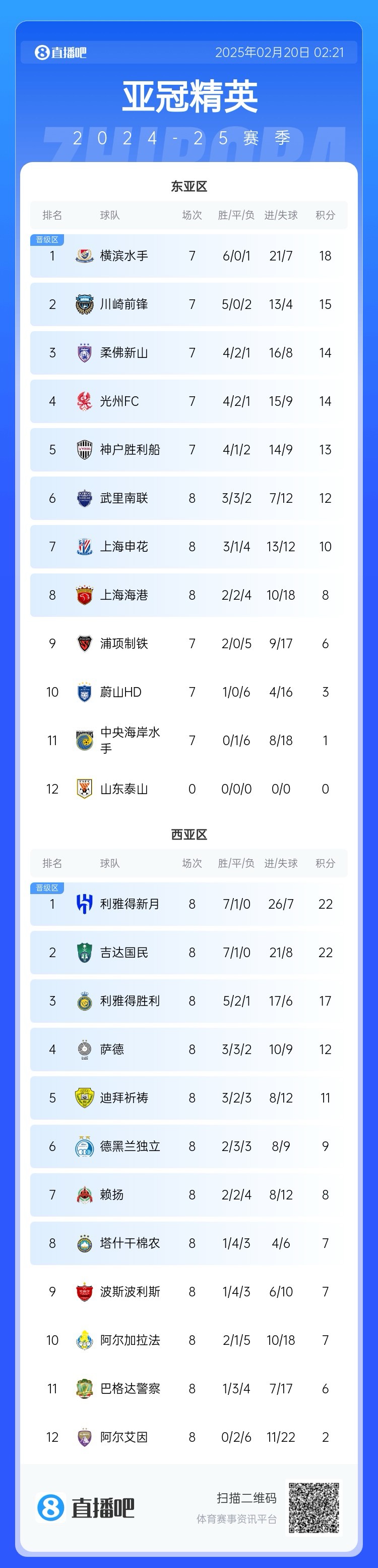 02月20日訊 亞足聯(lián)官方更新了亞冠積分榜和晉級球隊,最新積分榜中,山東泰山戰(zhàn)績清零!