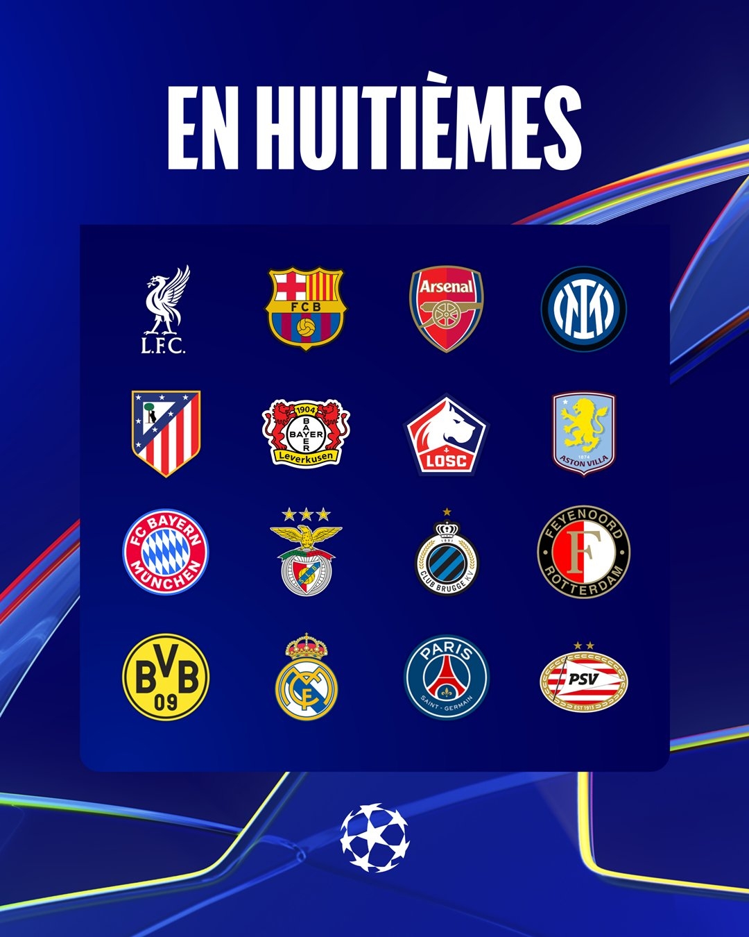 附加賽晉級(jí)8隊(duì):本菲卡、拜仁慕尼黑、費(fèi)耶諾德、布魯日、多特蒙德、巴黎圣日耳曼、皇家馬德里、埃因霍溫
