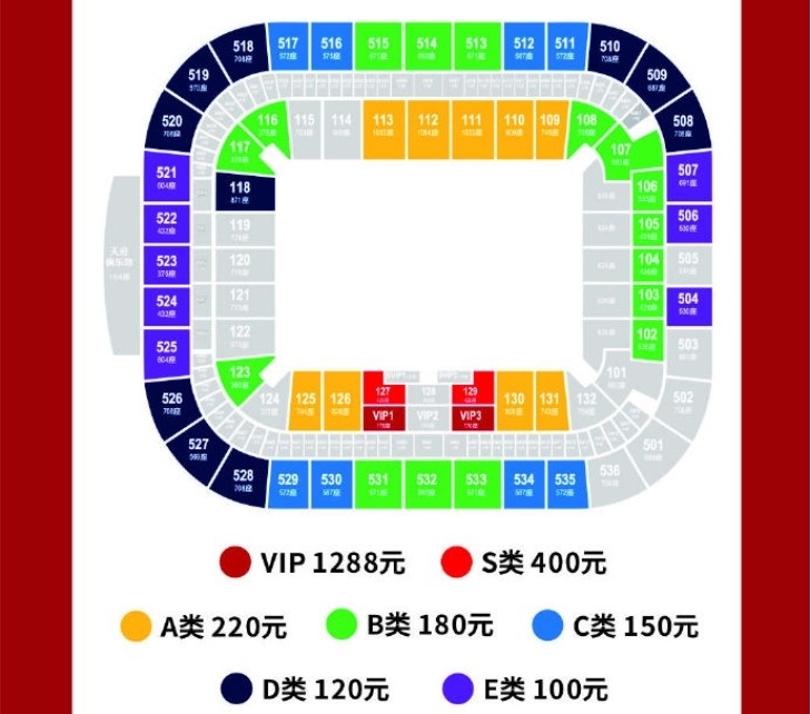 本場比賽票價(jià)分為7檔,從低到高分別為100元、120元、150元、180元、220元、400元、1288元。