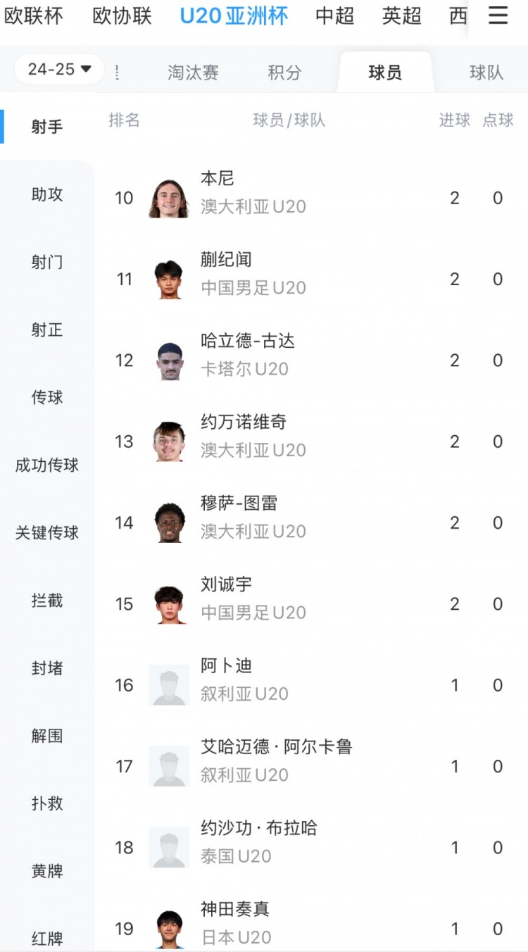 而在射手榜中,國(guó)青3將躋身射手榜前10,分別是朱鵬宇、蒯紀(jì)聞和劉誠(chéng)宇,3人均在本屆賽事打進(jìn)2球,并列排在射手榜第4位。