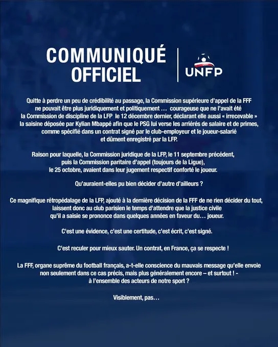 法國職業(yè)球員工會發(fā)表官方公告,嚴厲批評法國足協(xié)上訴委員會延續(xù)法國職業(yè)聯(lián)盟紀律委員會去年的決定,前者對姆巴佩和巴黎的薪資糾紛案“不予受理”。