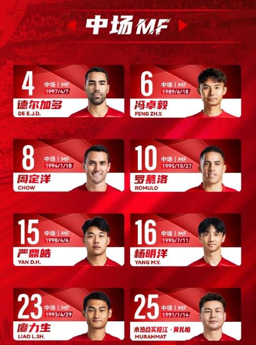 中場(chǎng):4-德?tīng)柤佣唷?-馮卓毅、8-周定洋、10-羅慕洛、15-嚴(yán)鼎皓、16-楊明洋、23-廖力生、25-木熱合買(mǎi)提江-莫扎怕、20-木塔力甫-依明卡日、39-甘超、58-廖榮祥