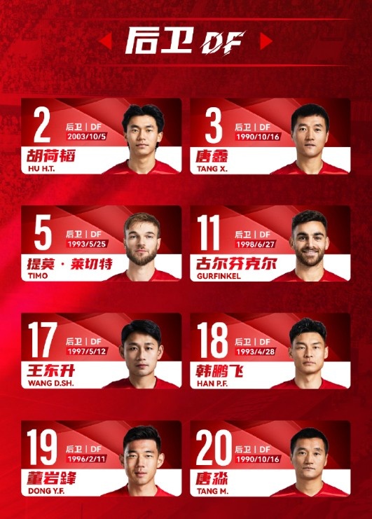 門(mén)將:1-蹇韜、14-冉偉楓、32-劉殿座、60-唐梓程